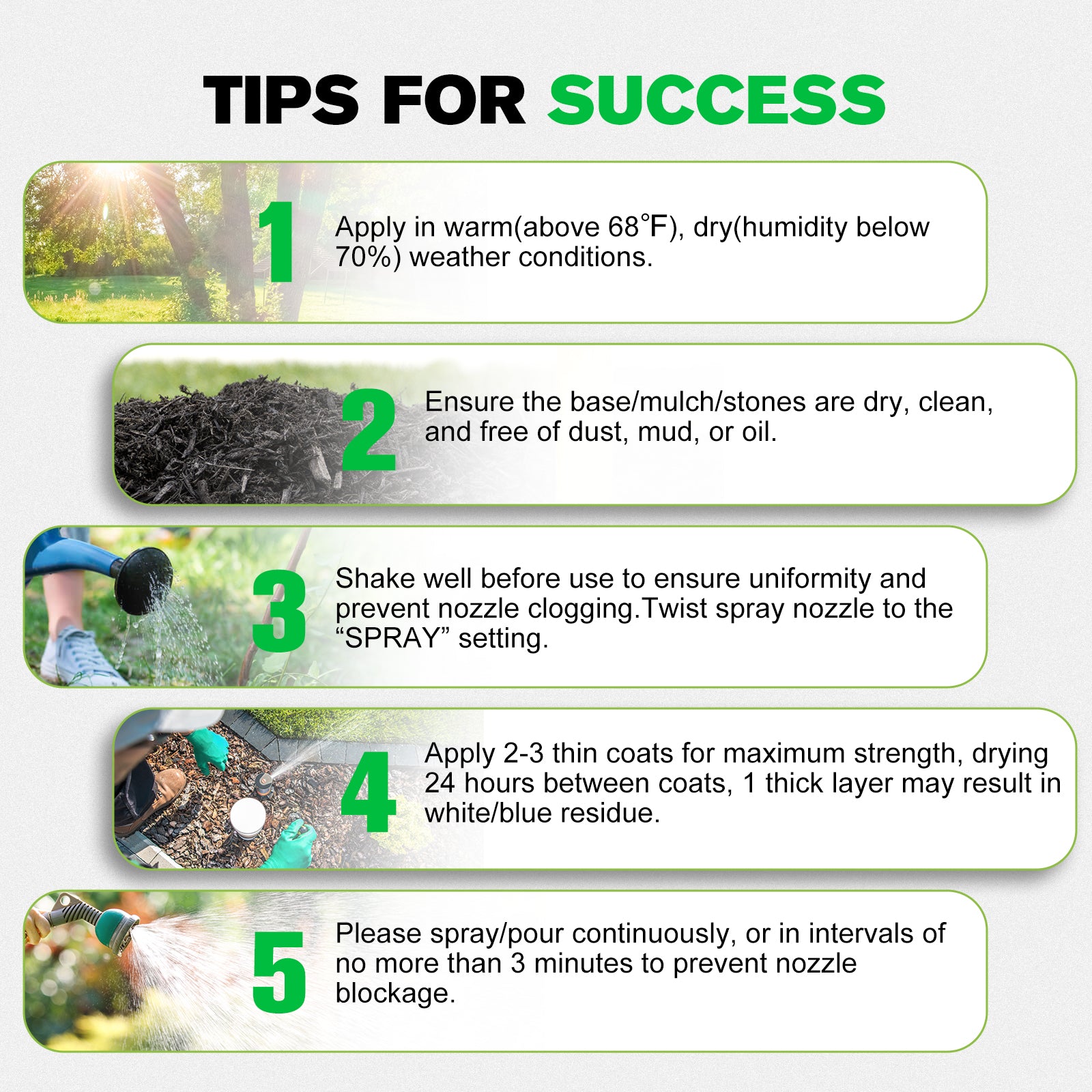 - Easy Go with Clear Guide: Achieving a flawless, clean finish has never been easier. For landscape areas, spray the glue directly without dilution, and apply 2–3 thin coats for enhanced adhesion and strength. In hot weather, the mulch spray glue dries faster, so to prevent clogging, keep spray intervals under 5 minutes. Test a small area before applying to large spaces. For the best results, contact us for construction guidance before starting