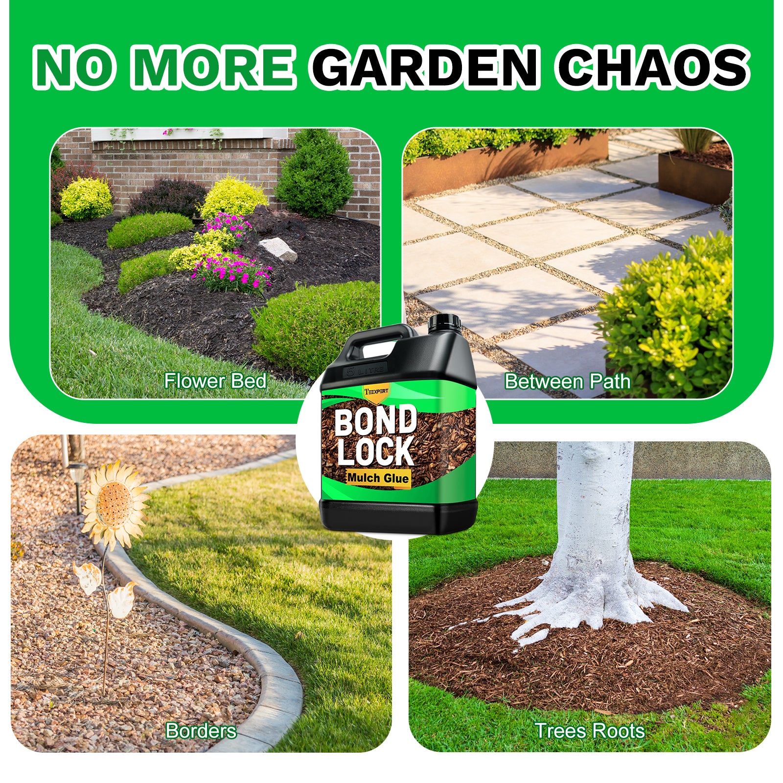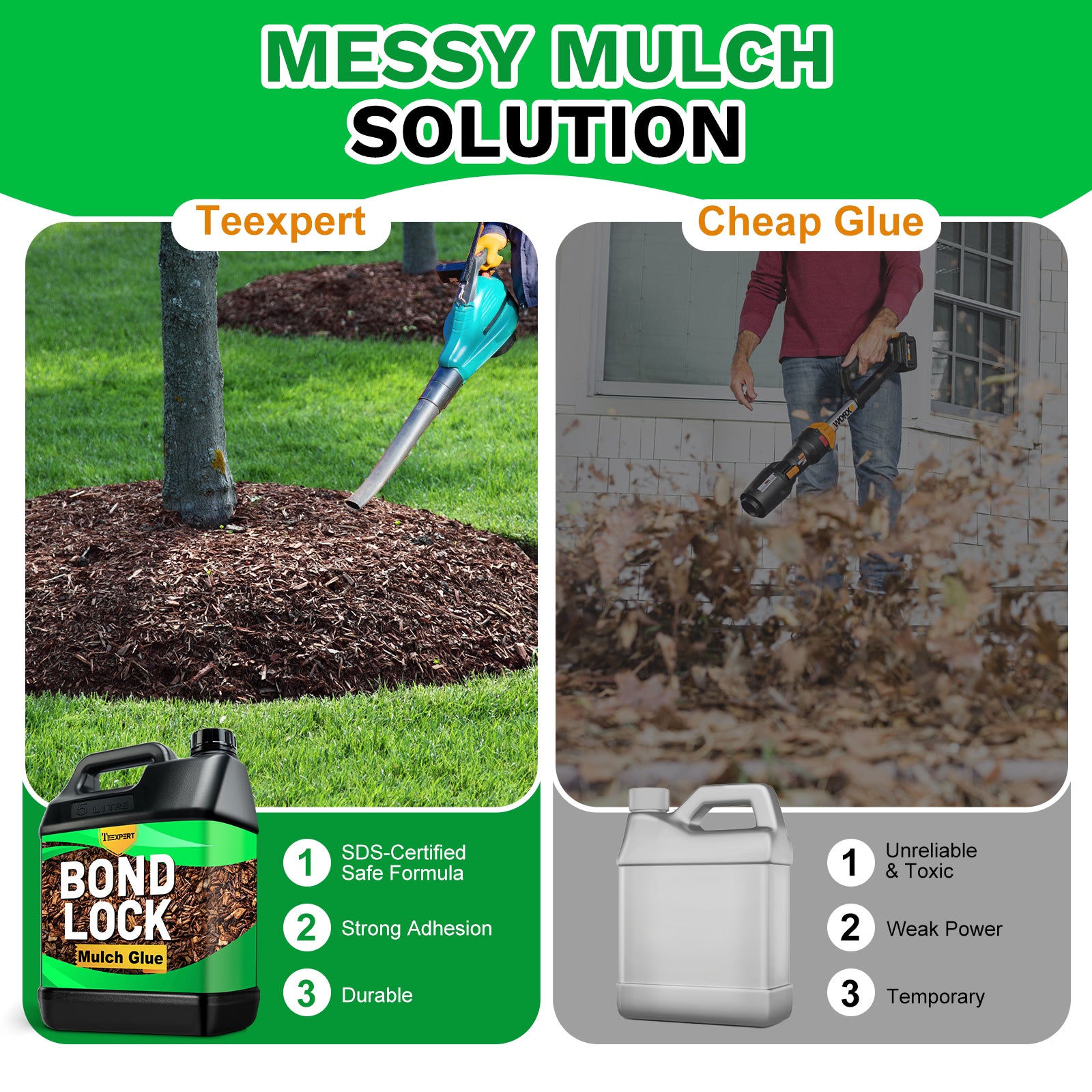 - BOND LOCK GLUE SOLUTION: Tired of constantly cleaning up scattered mulch and gravel after every storm, wind gust, or playful pet? Teexpert Bond Lock mulch glue helps you lock loose mulches in place, preventing them from being displaced by rain or wind. It saves you the hassle of frequent cleanups, ensuring your garden border and lawn stays neat and pristine—without the added cost of landscaper maintenance