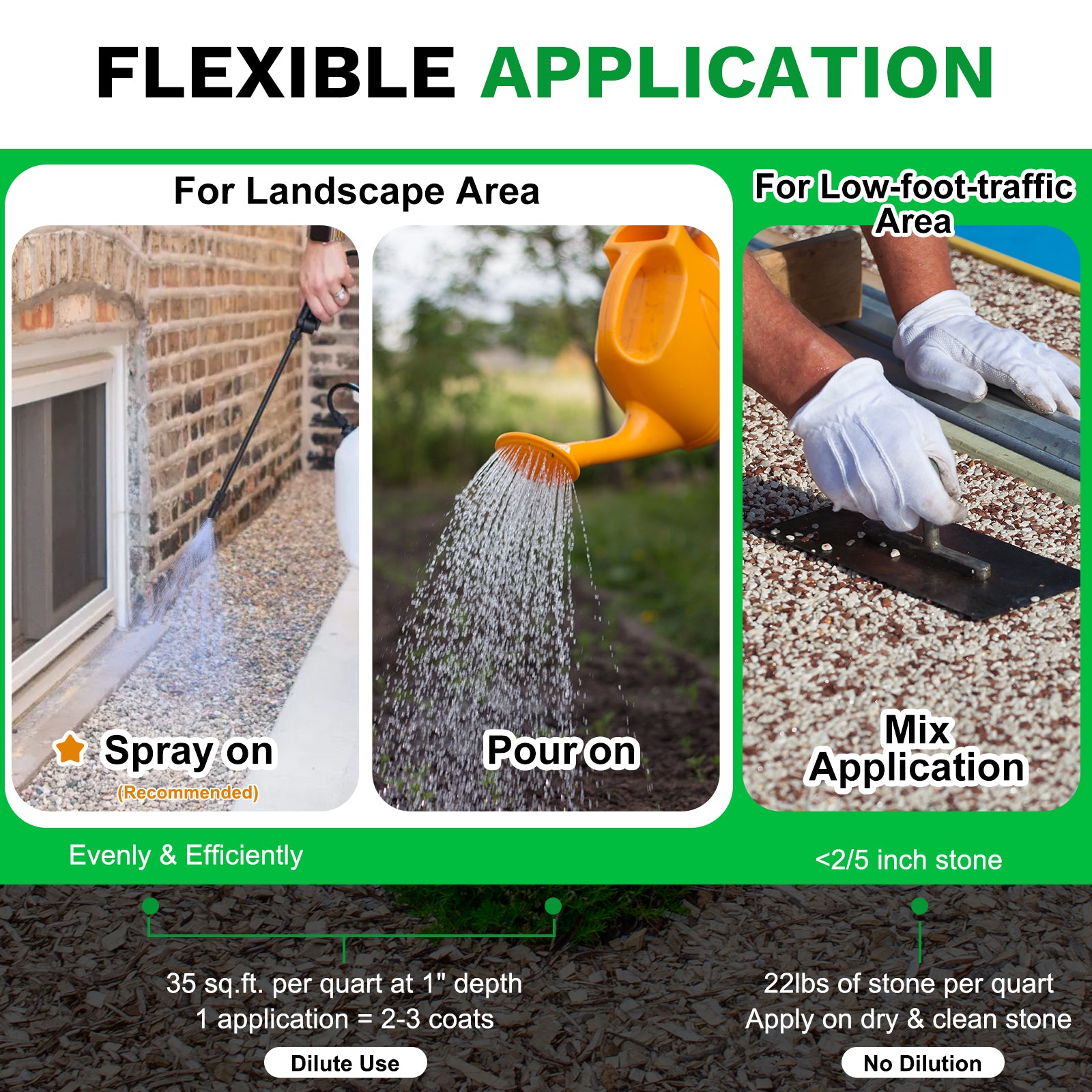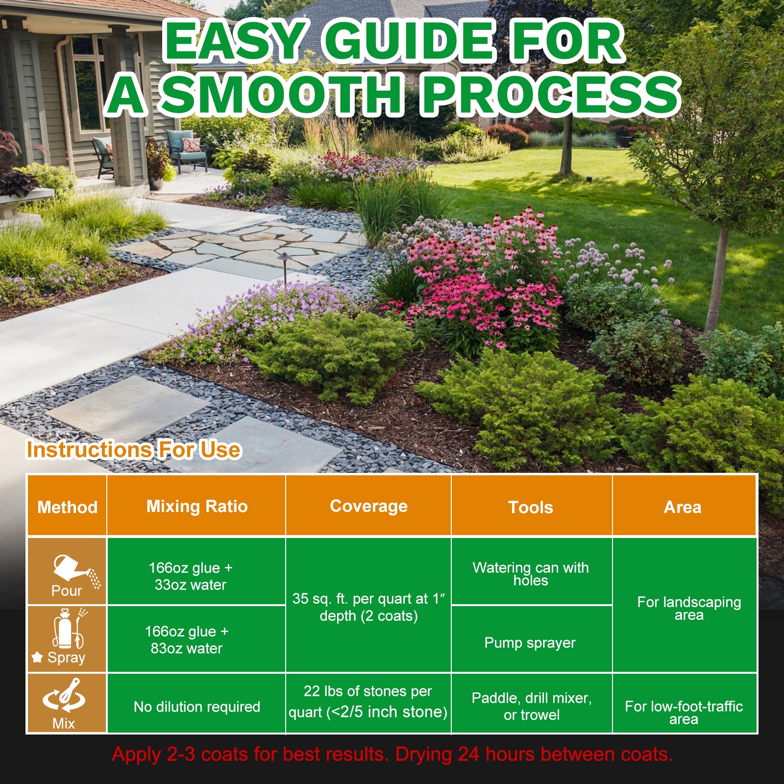 - EASY GO WITH CLEAR GUIDE: Achieving a flawless, clean finish has never been easier. For landscape areas, spray the glue after diluted 166OZ glue with 83oz water, and apply 2–3 thin coats for enhanced adhesion and strength. For low-foot traffic areas, mix with clean, dry stones (< 2/5 inch) without dilution. Test a small area before applying to large spaces. For the best results, contact us for construction guidance before starting