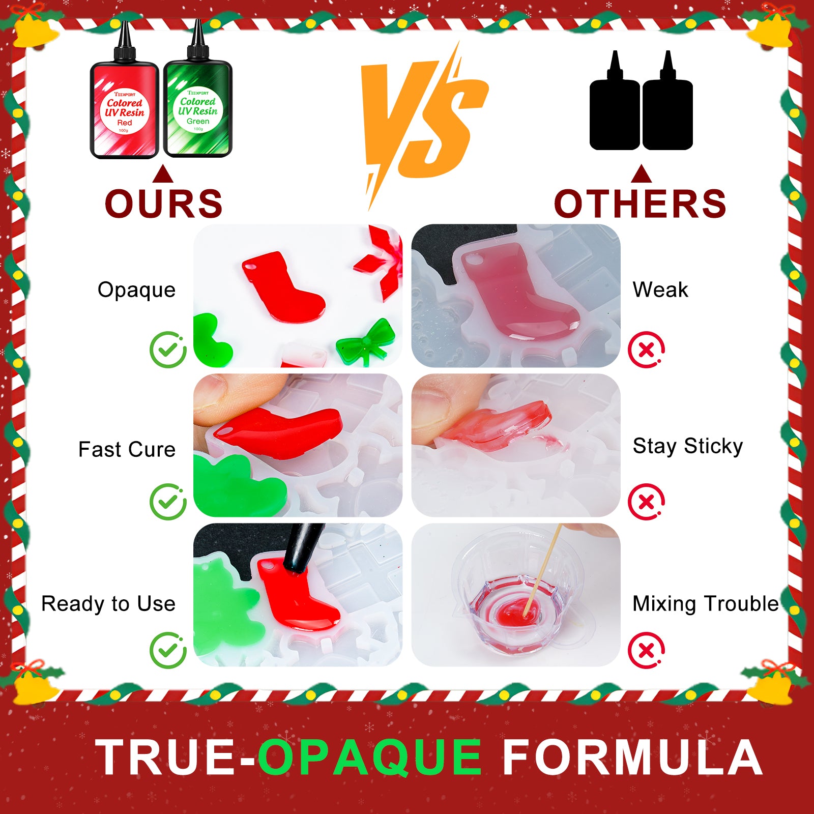 - BIGGER SIZE, BETTER VALUE: Introducing our festive Christmas set, the perfect blend of red and green uv resin—your essential colors for holiday crafting. Each bottle is a generous 100g, giving you over 3 times more than the standard 30g. Whether it’s color, quality, or quantity, it’s next level and truly reliable